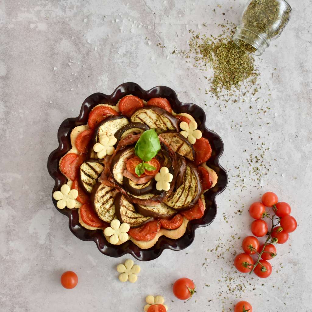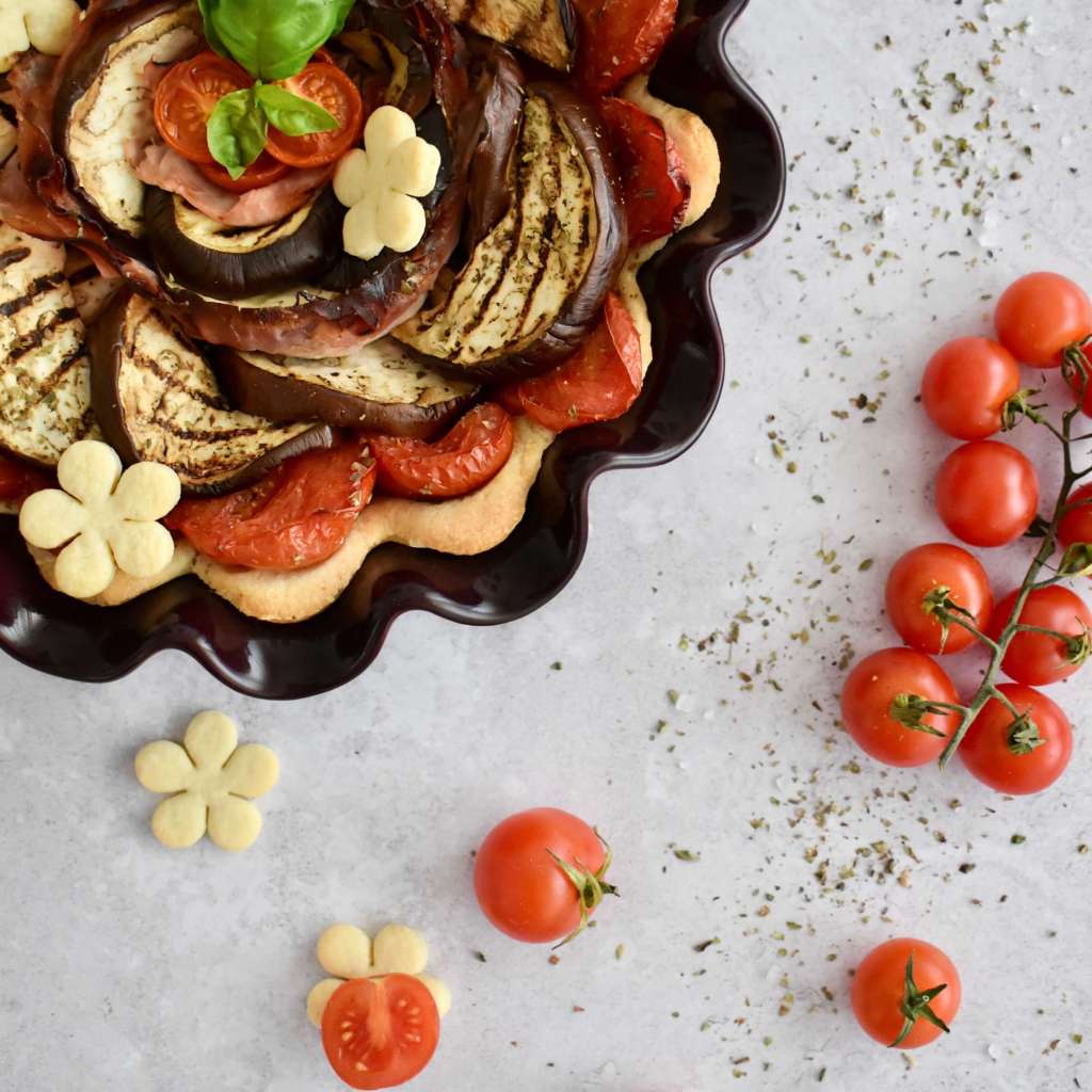 frolla al pecorino con melanzane, pomodori e prosciutto cotto