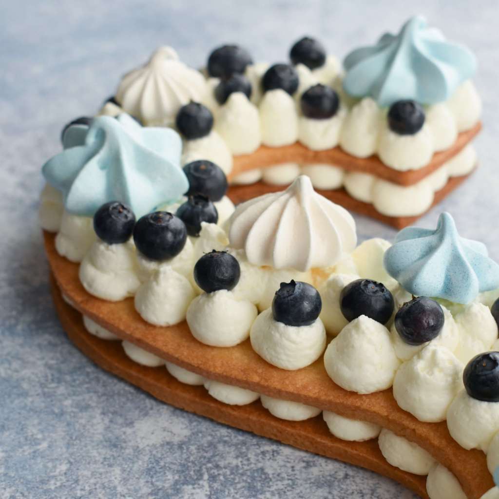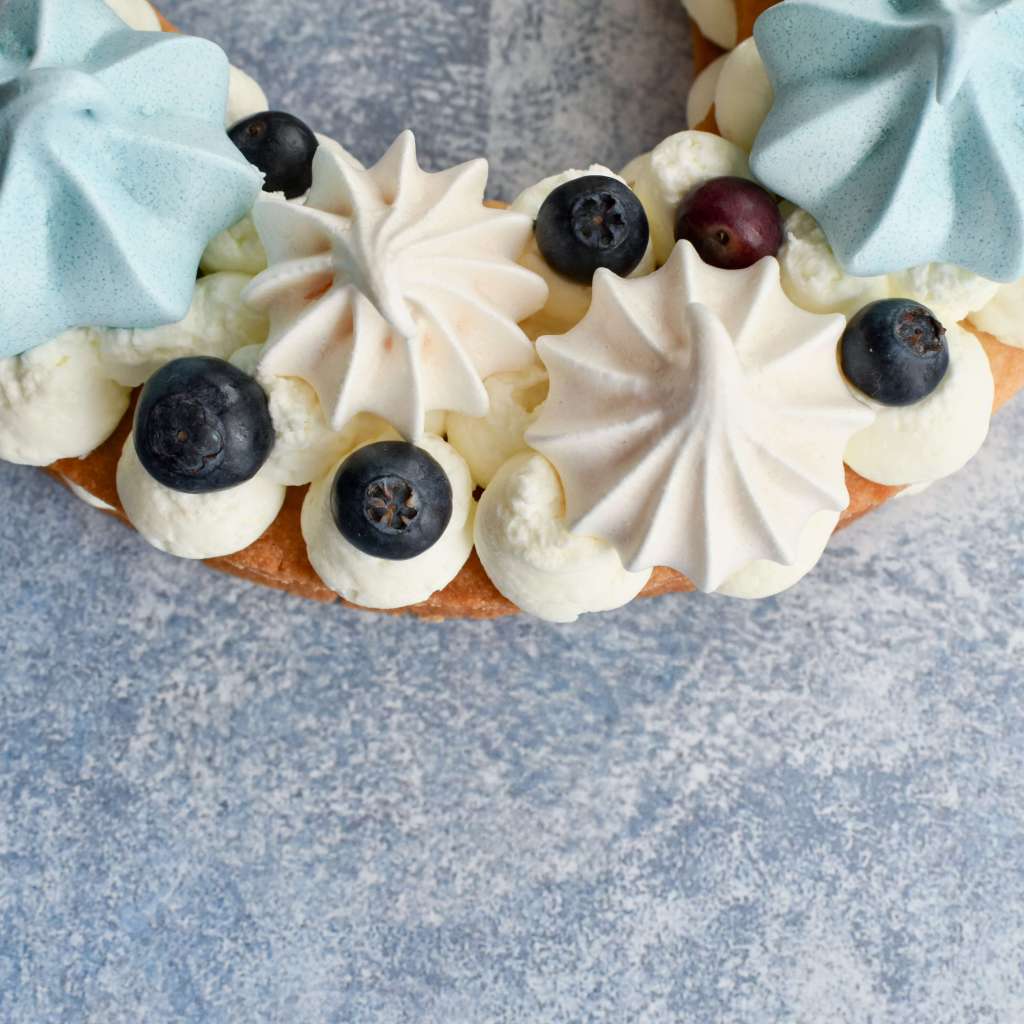 Per comodità ho preparato la frolla un paio di giorni prima e la crema la sera prima del compleanno. La pasta frolla l’ho conservata in una tortiera, la crema in frigo. Il giorno del compleanno ho assemblato e decorato la torta con i mirtilli e le meringhe, realizzate nei giorni precedenti con gli albumi avanzati durante la preparazione della frolla. A breve pubblicherò anche la ricetta delle meringhe.