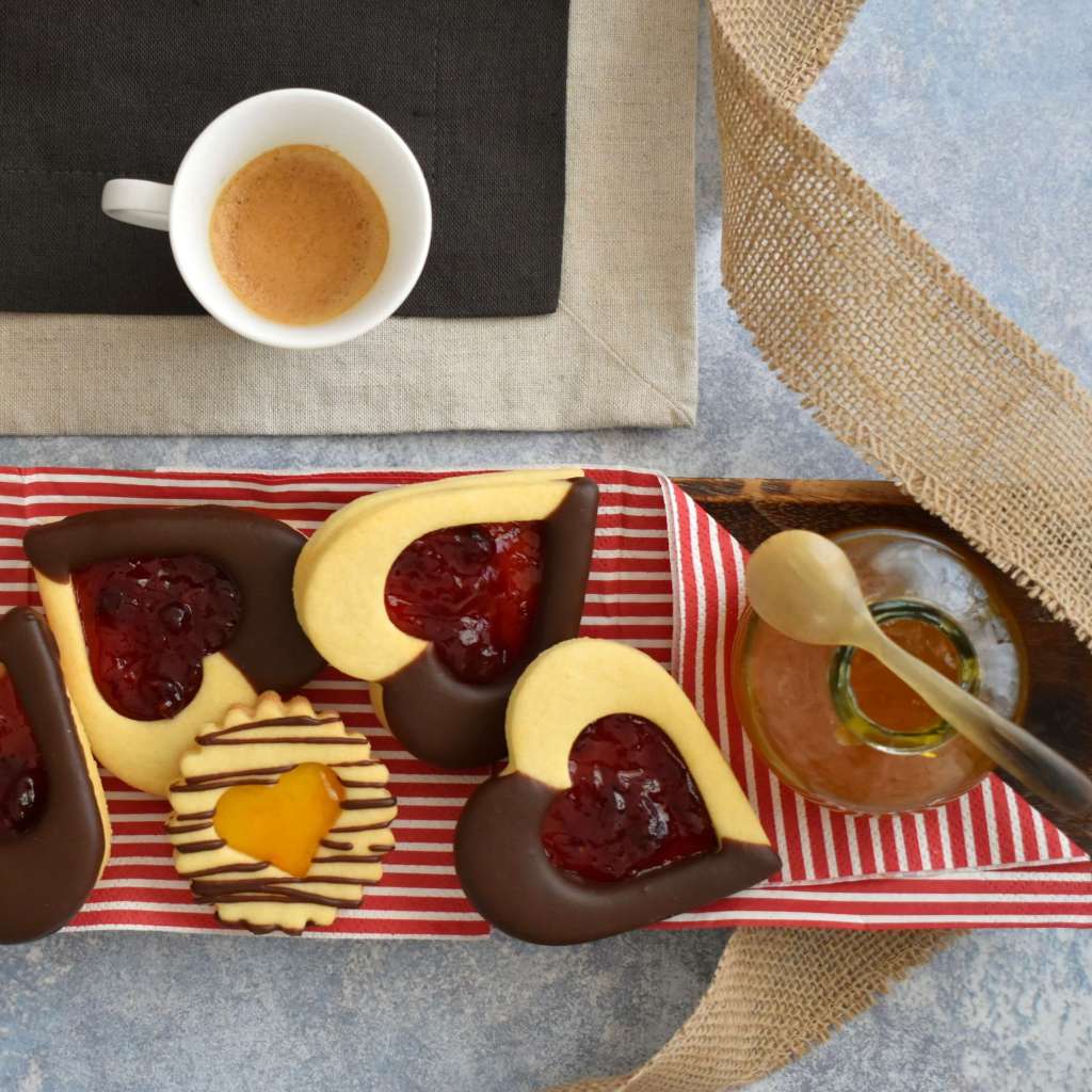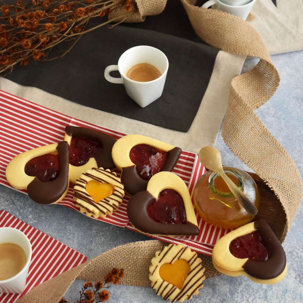 La ricetta della mia frolla è sempre la stessa (vedi La mia pasta frolla). Dopo aver fatto riposare in frigo la pasta, la lavoro appena con una spolverata di farina e stendo la pasta ad uno spessore di 3 mm aiutandomi con gli spessori in legno. Realizzo con le formine un numero pari di biscotti, di cui la metà con un foro centrale. Con una sottilissima spennellata di confettura attacco le lamelle di mandorle sui biscotti forati.