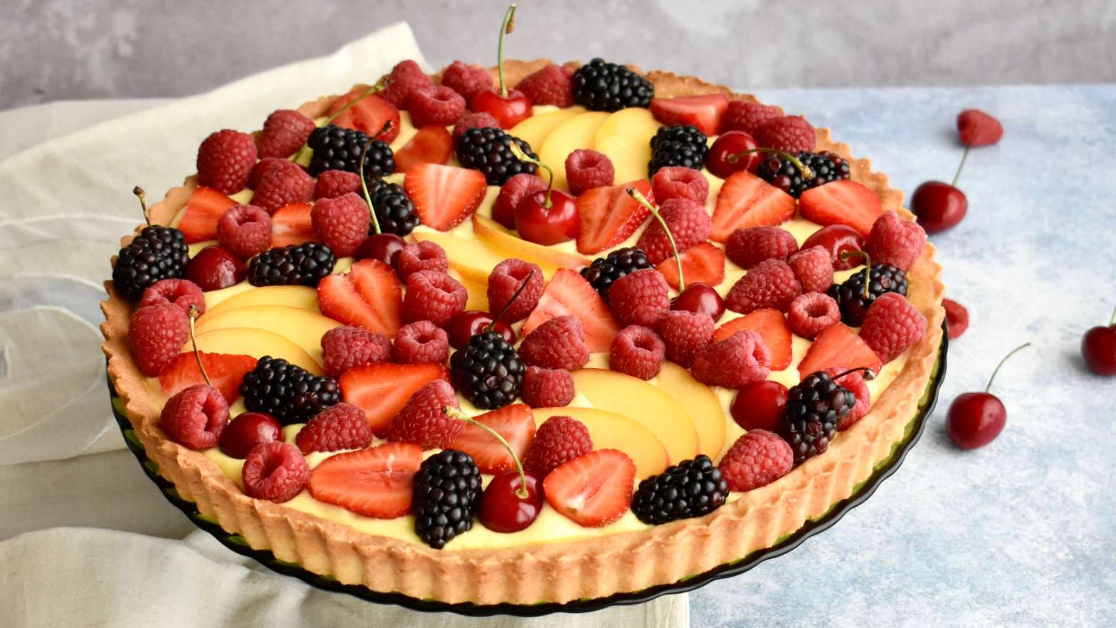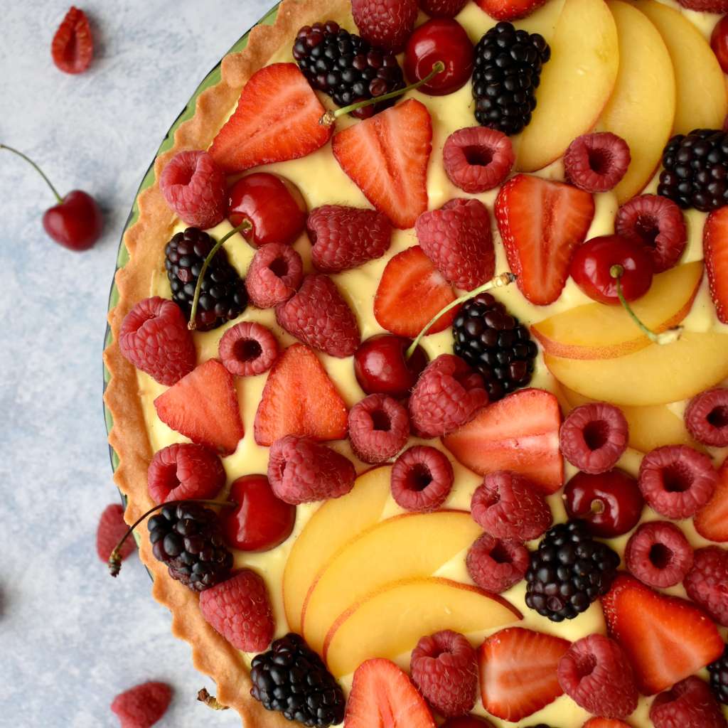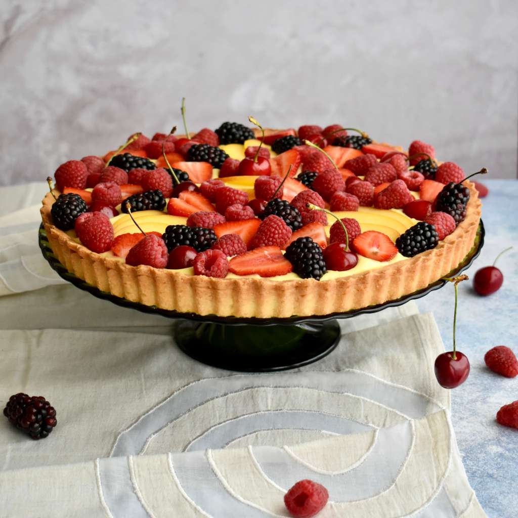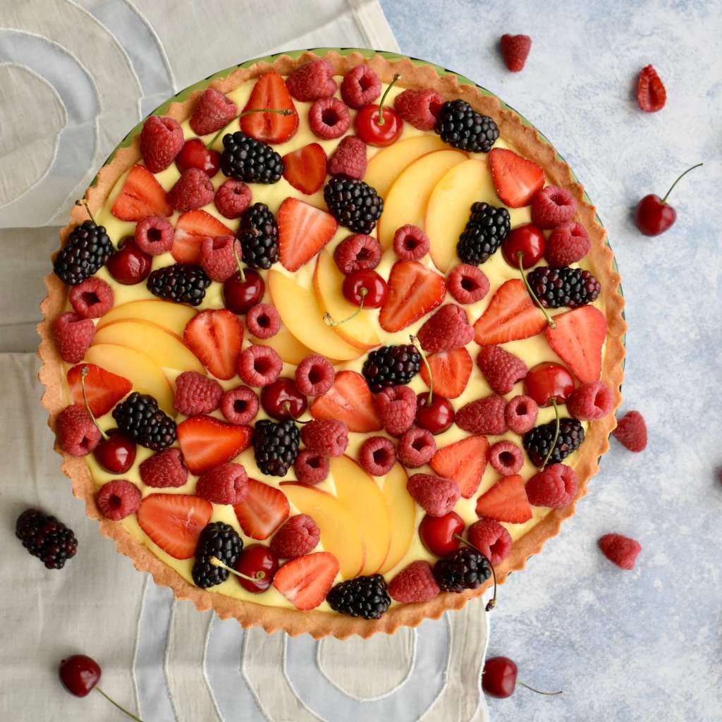 una pioggia di frutta fresca sopra un letto di frolla ricoperto da una soffice crema