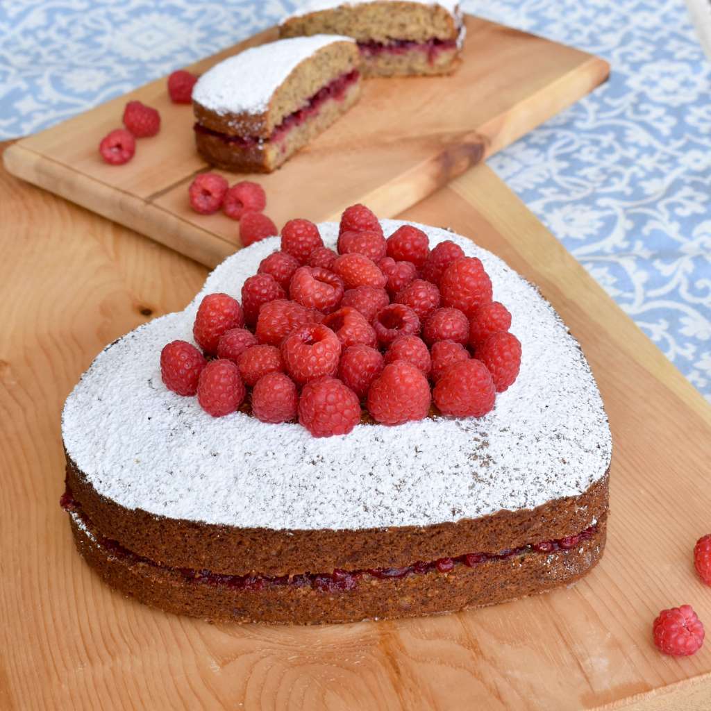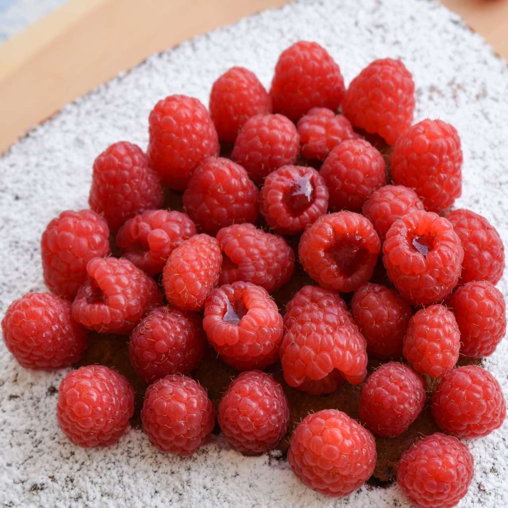 Faccio raffreddare completamente la torta, la taglio a metà e la farcisco con la composta di ribes rossi. Per decorare una spolverata di zucchero a velo e frutti rossi di stagione. Io ho scelto dei lamponi appena colti nel bosco, farciti con composta di ribes.
