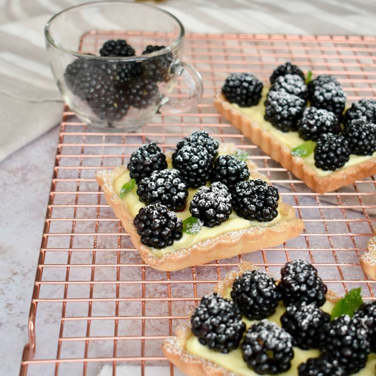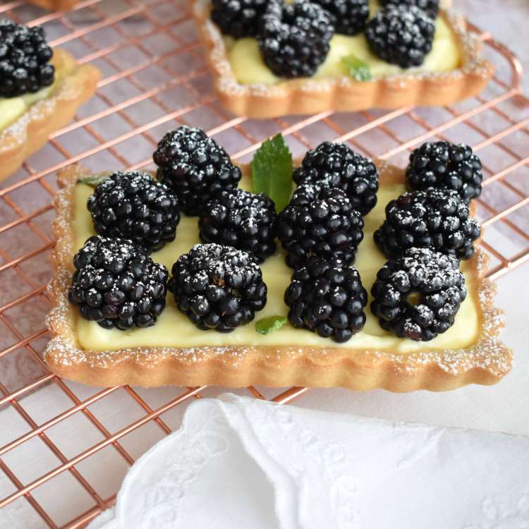 Ora che la mia crema è pronta posso farcire le crostatine, decorarle con more fresche, foglioline di menta ed una spolverata di zucchero a velo.