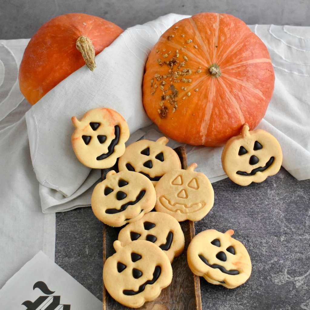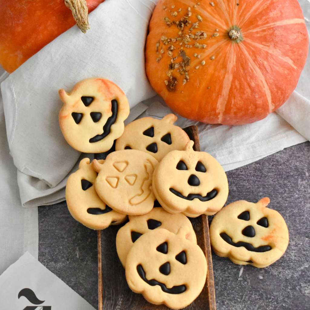 La ricetta della frolla è sempre la stessa (vedi La mia pasta frolla su ricette > dolci, a pagina 3). Se voglio dare un po’ di colore alle mie zucche inserisco nella frolla una punta di colorante alimentare in gel (per ottenere l’effetto cromatico striato, stile “tie dye”, aggiungo il colore dopo che l’impasto è pronto e lo mescolo per poco in modo tale che il colore non diventi omogeo su tutto l’impasto; se lo inserisco all’inizio, insieme agli ingredienti otterrò invece un colore pieno). Preparo con la formina un numero pari di zucche, di cui la metà con i fori e l’altra metà senza. Per semplicità, dopo aver fatto riposare la frolla 40 minuti in frigo e dopo averla lavorata un attimo con una spolverata di farina, la stendo con uno spessore di circa 5 mm direttamente sopra un foglio di carta forno. I biscotti li creo direttamente lì. In questo modo i miei biscotti non rischiano di deformarsi mentre li sposto da un piano sul foglio di carta forno. Faccio cuocere le mie zucche di frolla in forno ventilato a 180° per 10 minuti.