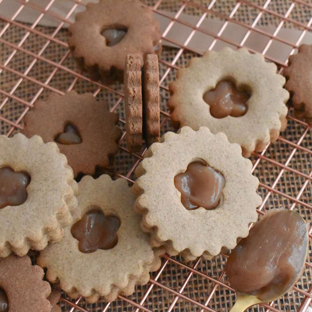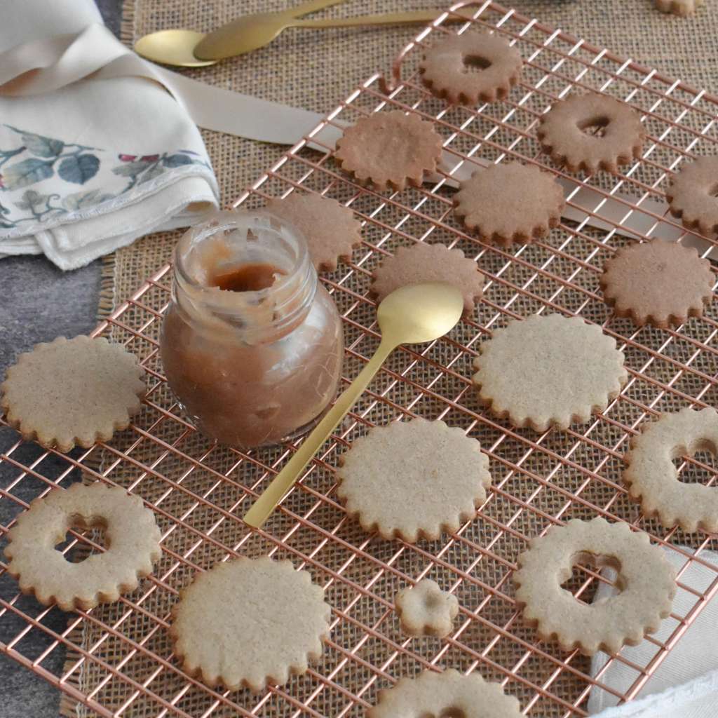Creo l’impasto e lo divido in due panetti. Un panetto lo avvolgo nella pellicola così com’è e lo metto in frigo, all’altro aggiungo due cucchiai di cacao amaro, lo lavoro appena per farlo amalgamare bene, lo avvolgo nella pellicola e lo metto in frigo insieme all’altro panetto. Dopo aver fatto riposare la frolla in frigo la lavoro con una spolverata di farina di grano saraceno e la stendo ad un’altezza di 5 mm, aiutandomi con gli spessori in legno (gli spessori mi aiutano a mantenere uno spessore costante e li uso soprattutto quando faccio i biscotti, in questo modo ottengo una cottura uniforme ed evito di sprecare impasto) e facendo quest’operazione direttamente sopra un foglio di carta forno: i biscotti li creo direttamente lì. Creo un numero pari di biscotti di cui la metà con un foro centrale e l’altra metà senza.