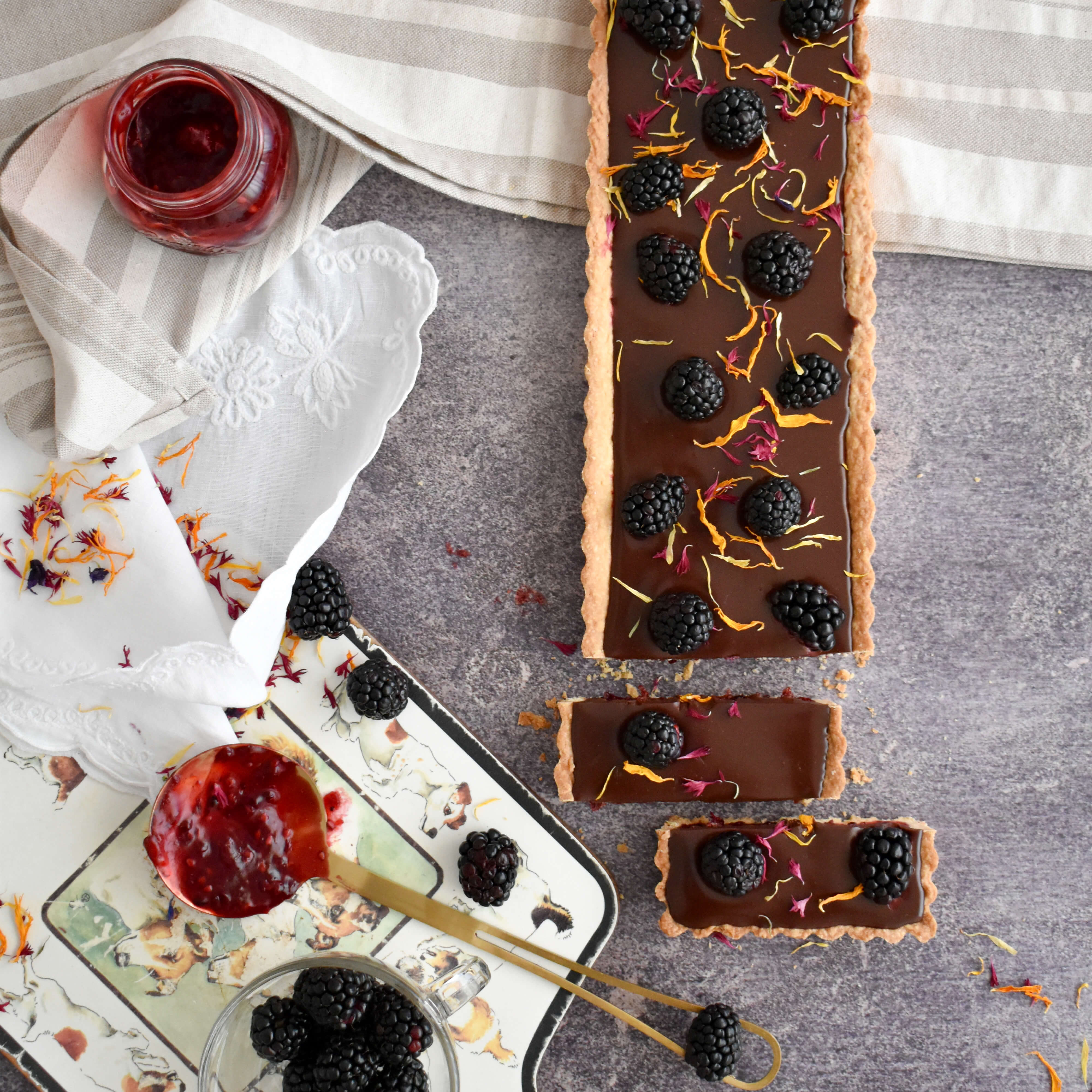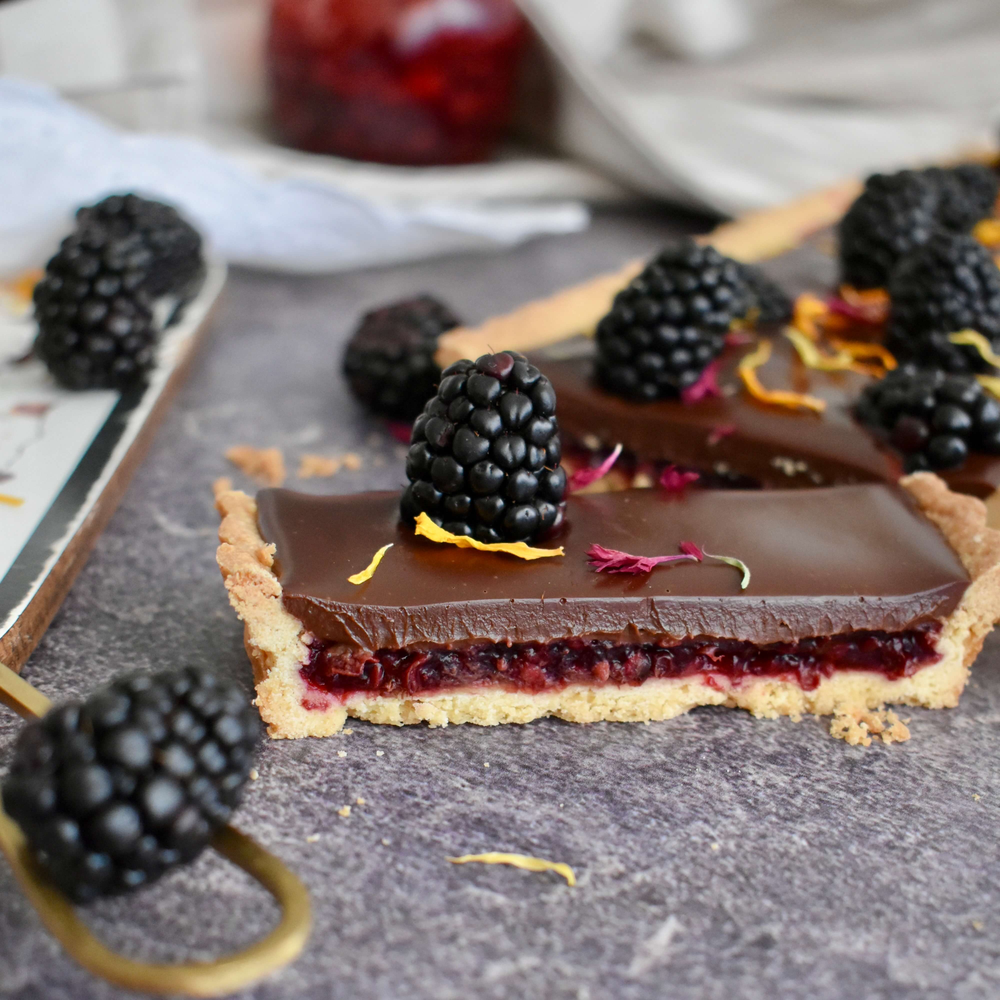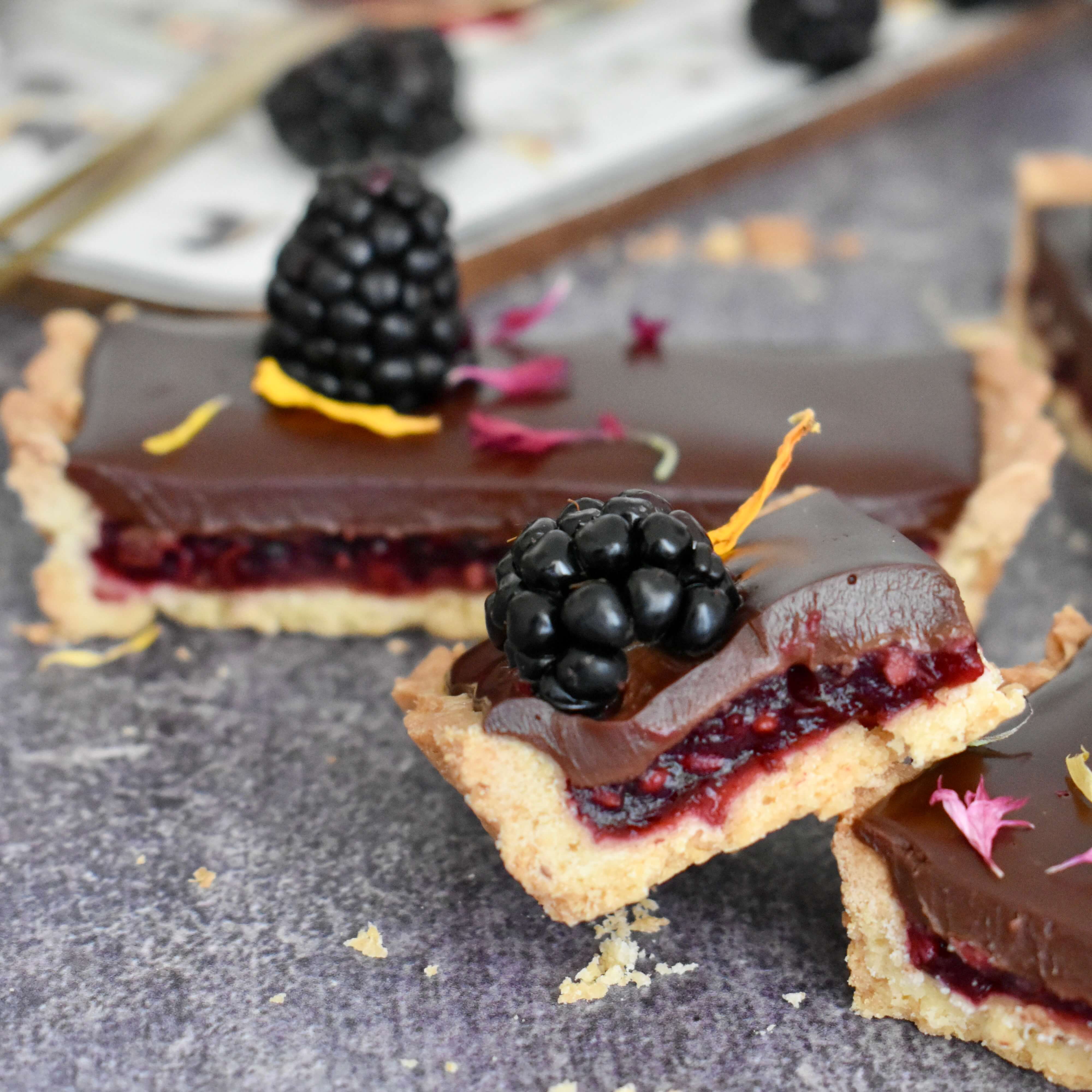 È ora di dedicarsi alla copertura al cioccolato fondente. Taglio grossolanamente il cioccolato fondente e lo metto in una ciotola in vetro, scaldo la panna portandola quasi ad ebollizione, la verso nella ciotola con il cioccolato e mescolo velocemente con una frusta fino ad ottenere un composto liscio e lucido. Verso il cioccolato sopra lo strato di more ormai raffreddato e faccio raffreddare ulteriormente l’ultimo strato per 1 ora in frigo. Finisco la decorazione con more fresche e fiori commestibili.