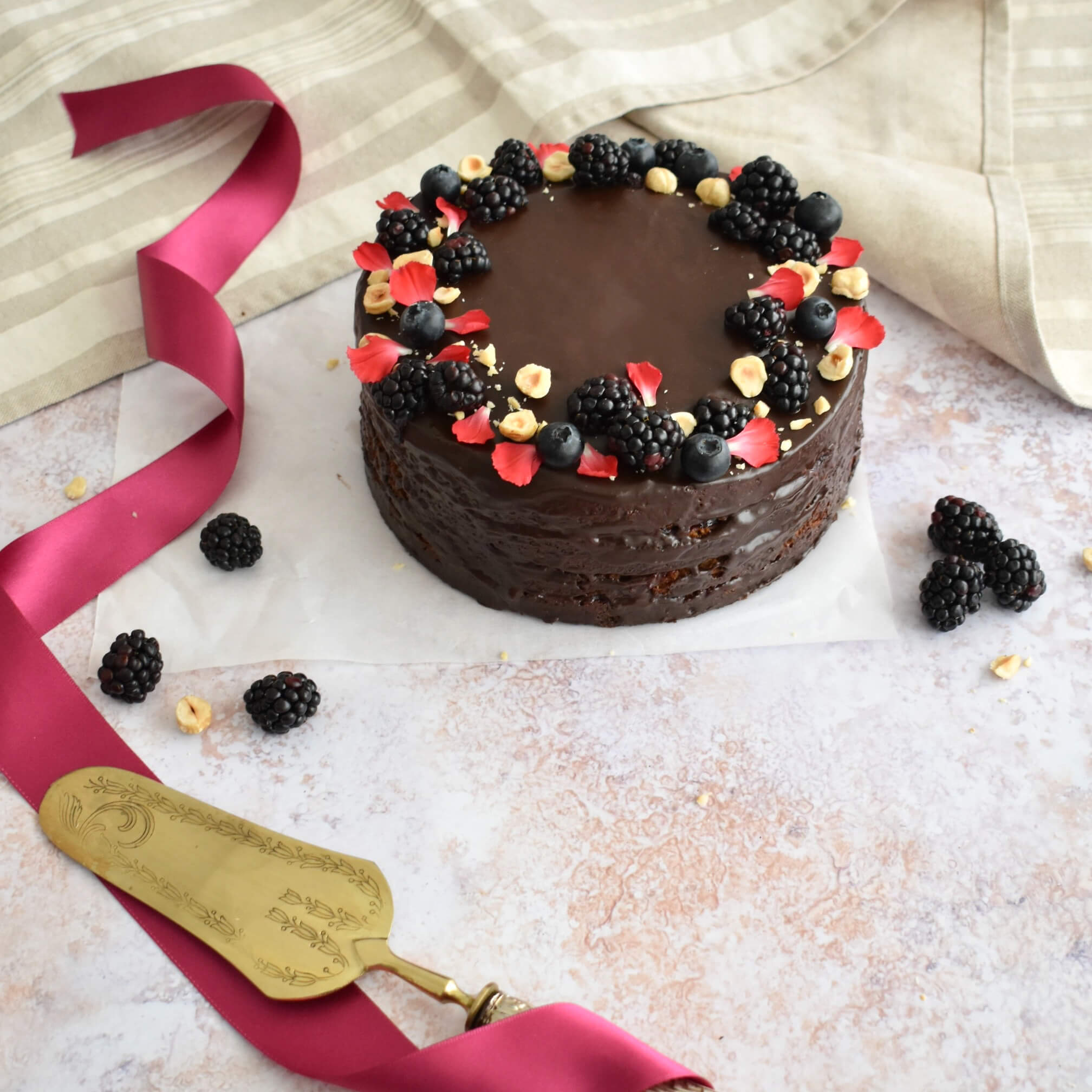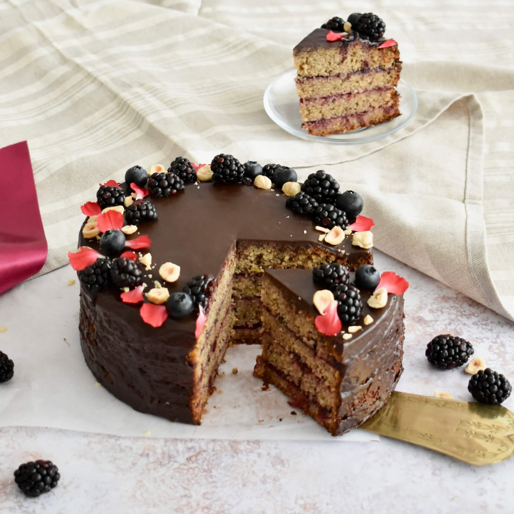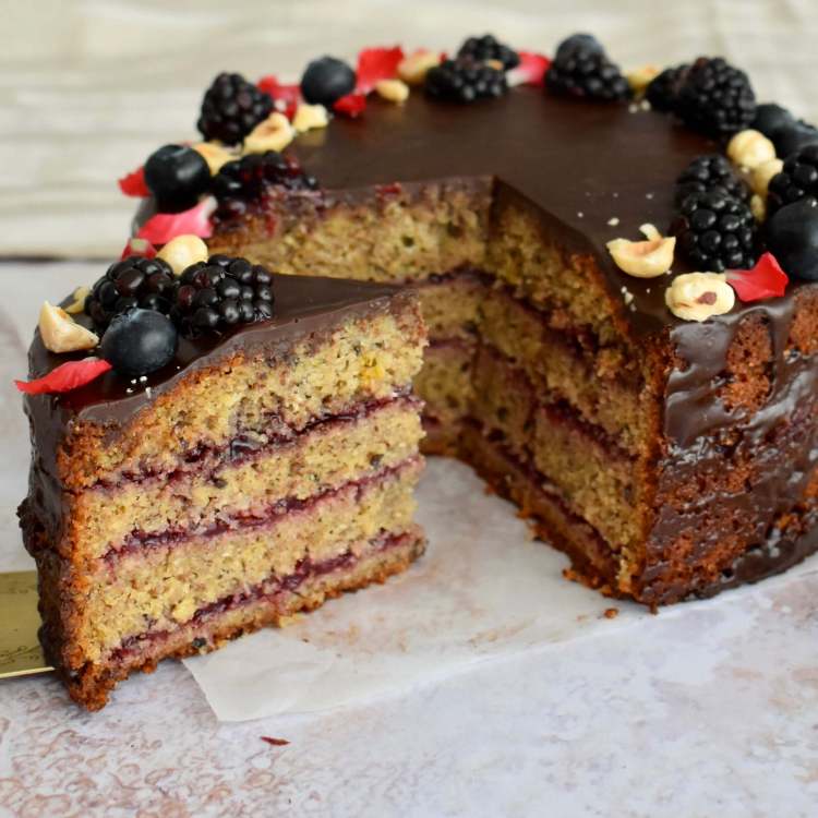 Faccio raffreddare completamente la torta, la taglio in altezza 3 volte e la farcisco con la composta di ribes o frutti di bosco. È ora di dedicarsi alla copertura al cioccolato fondente taglio grossolanamente il cioccolato fondente e lo metto in una ciotola in vetro, scaldo la panna portandola quasi ad ebollizione (ma senza farla bollire), la verso nella ciotola con il cioccolato e mescolo velocemente con una frusta fino ad ottenere un composto liscio e lucido. Lascio intiepidire il cioccolato a temperatura ambiente per 5-10 minuti, deve essere ancora fluido ma non bollente, lo verso sopra la torta facendolo colare anche in altezza dove lo spalmo con il dorso di un cucchiaio e faccio raffreddare la torta in frigo. Finisco la decorazione con more fresche, mirtilli e nocciole.