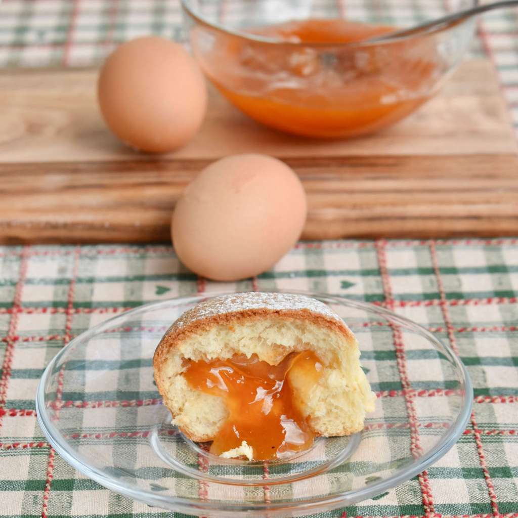 Stendo l’impasto con spessore di 1 cm circa, e faccio dei cerchi con uno stampino rotondo con Ø 6 cm. Allargo leggermente con le dita i bordi dei tondini per farcirli più facilmente con la confettura di albicocche che metto solo al centro, poi li chiudo bene. Spennello la superficie dei buchteln con il burro fuso rimasto.