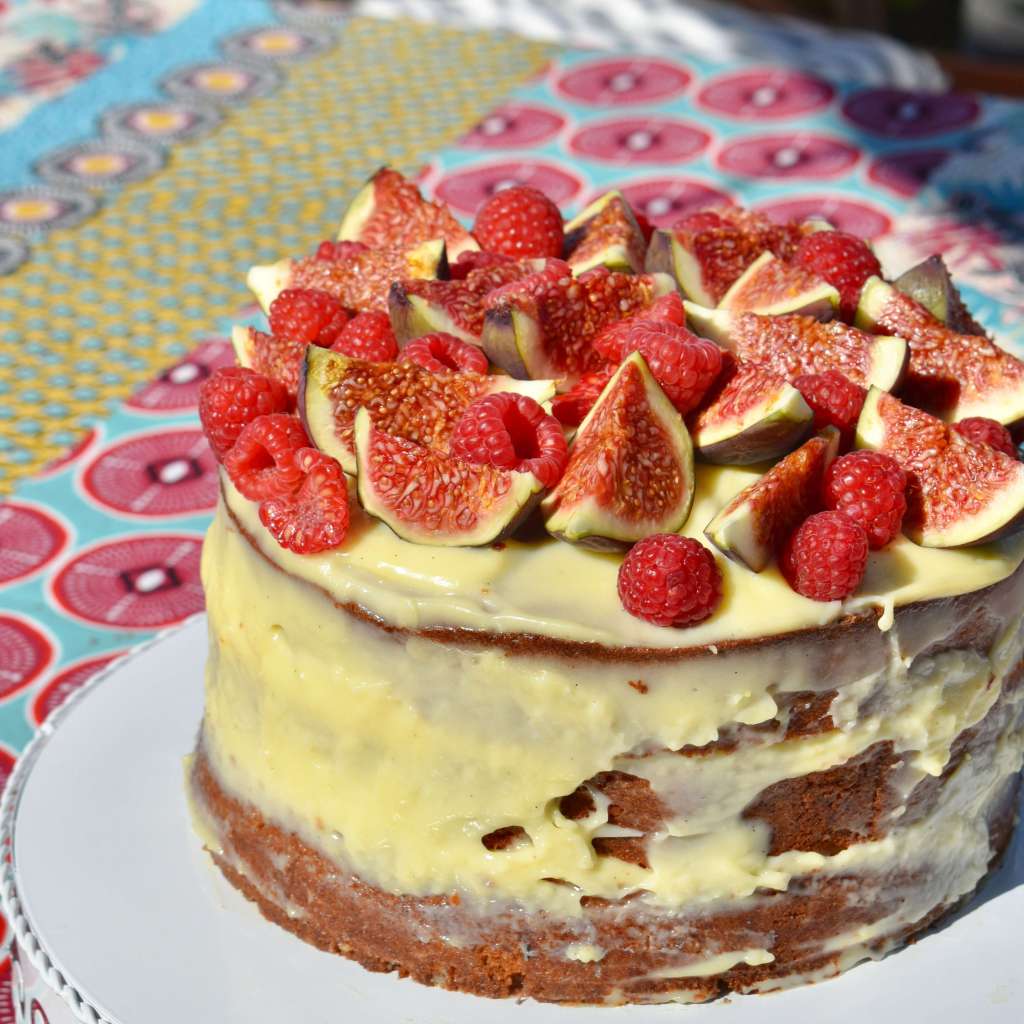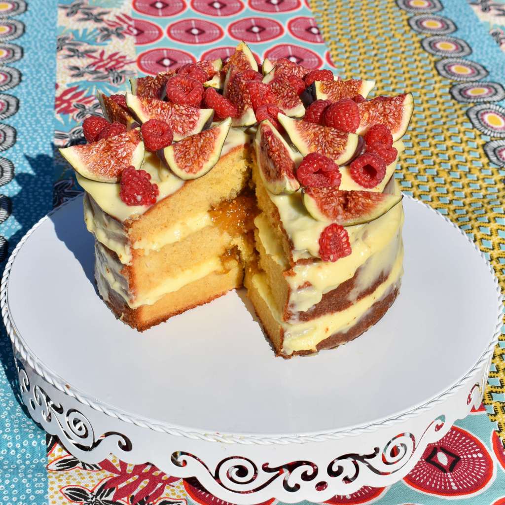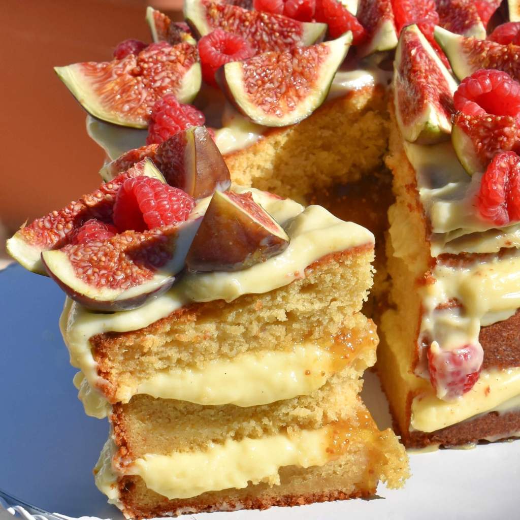 Quando la torta si è completamente raffreddata la taglio in altezza due volte con un coltello grande e seghettato. Per facilitare l’assemblaggio della torta inserisco sia la crema che la confettura di fichi in due sac à poche distinte. Inizio a farcire la torta con la crema partendo dall’esterno e lasciando al centro della torta un cerchio con Ø di 7 cm dove vado ad inserire la confettura di fichi. Ripeto lo stesso passaggio. Arrivata in chiusura stendo con una piccola spatola la crema restante sopra la torta ed anche lungo la sua altezza. Decoro con fichi e lamponi freschi. La mia torta crema e fichi è pronta!