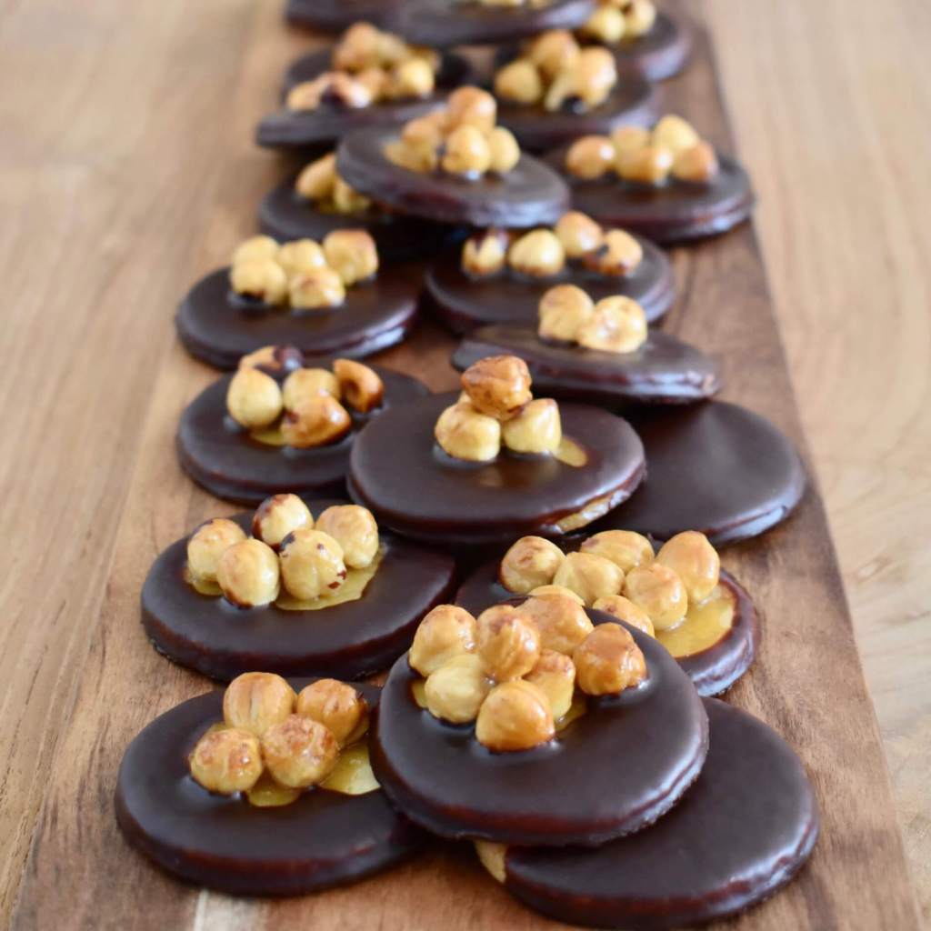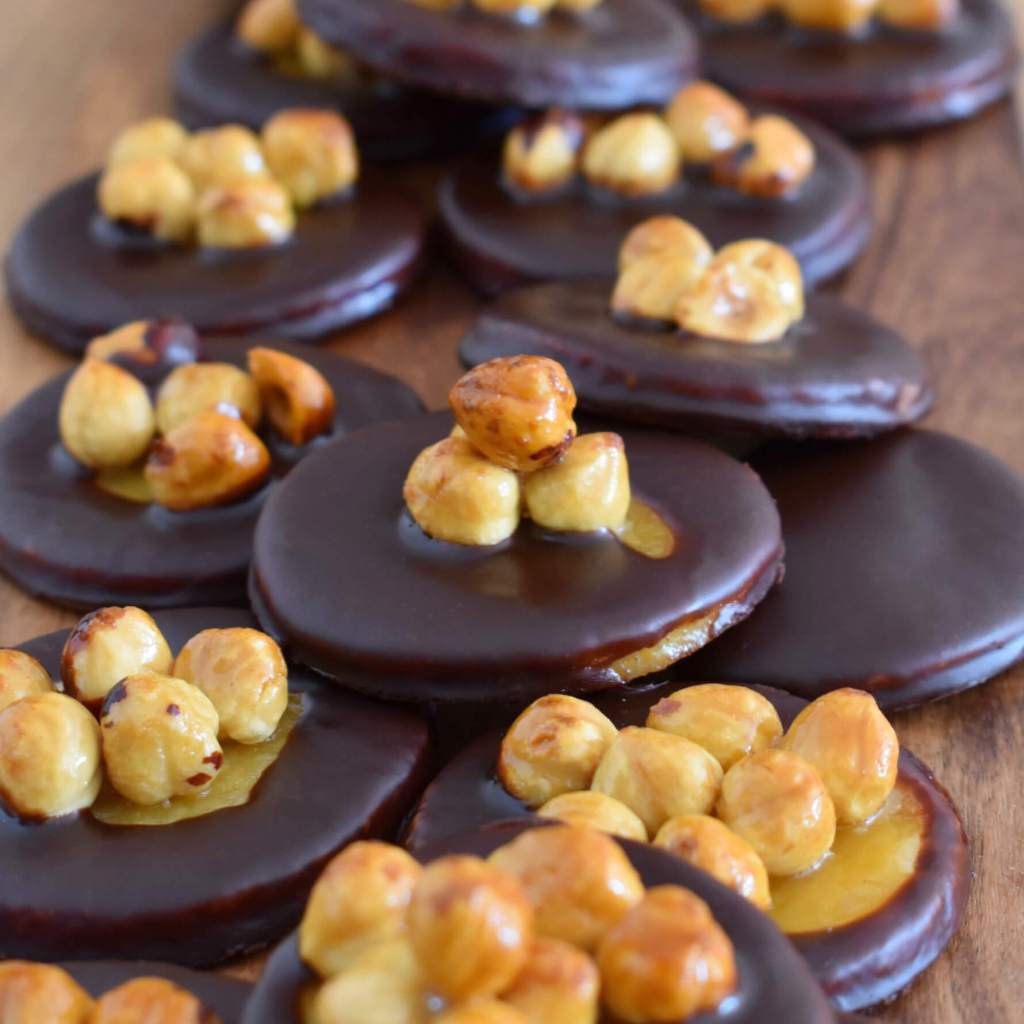 Metto su fuoco lento 25 g di zucchero, 35 g di miele e 20 ml di panna, fino a quando il composto inizia a bollire. Spengo il fuoco e aggiungo le nocciole con un cucchiaio di farina, mescolo con un mestolo di legno. Distribuisco le nocciole con un cucchiaio al centro dei biscotti lasciando un bordo di 1/2 cm (in base alla quantità di nocciole che desidero sui miei biscotti, importante è che ci sia il bordo). Rimetto i biscotti con le nocciole in forno a cuocere altri 6/7 minuti, fino a quando il bordo delle frolle inizia a dorarsi per bene. Faccio raffreddare completamente i biscotti a temperatura ambiente.