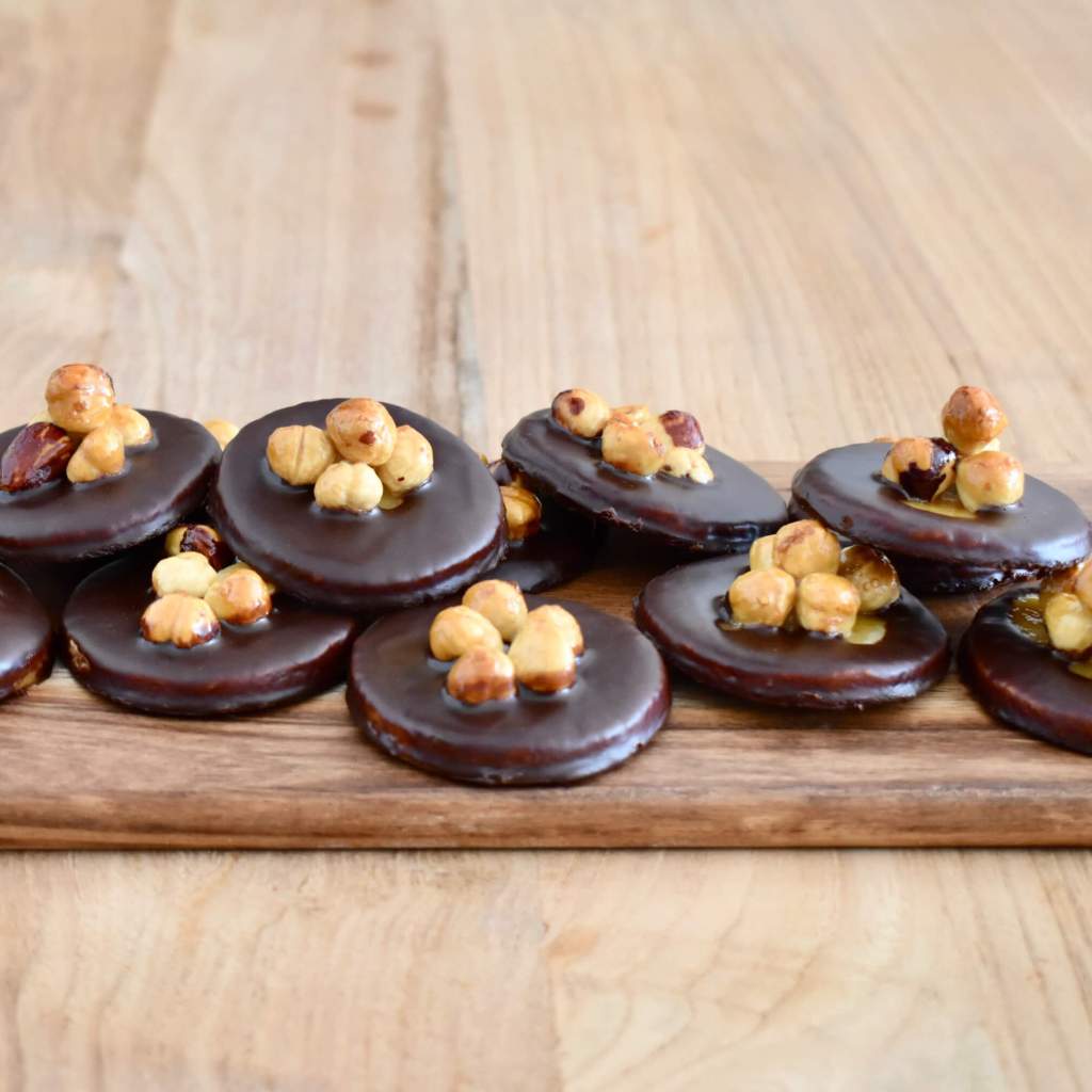 Quando i biscotti si sono raffreddati sciolgo a bagnomaria il cioccolato fondente e vi intingo i biscotti lateralmente facendo sì che la parte con le nocciole rimanga senza cioccolato e lascio asciugare su carta forno a temperatura ambiente per una notte.