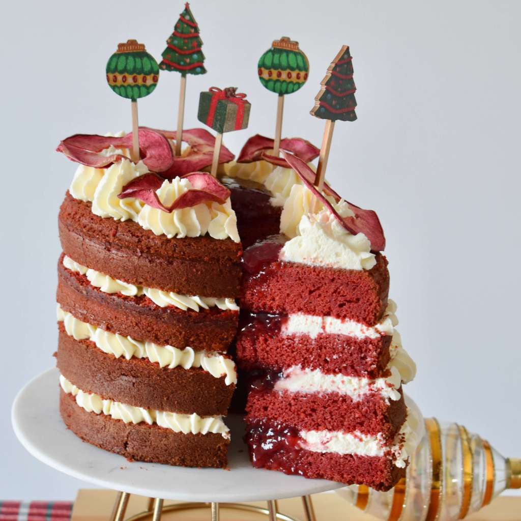 Comincio a lavorare con una frusta elettrica il burro a temperatura ambiente con lo zucchero fino ad ottenere una consistenza spumosa. Aggiungo le uova, i semi di metà baccello di vaniglia, il composto di latte, lo yogurt e limone ed il colorante mescolando a mano con una spatola. Infine unisco il cacao, il lievito e la farina setacciati e continuo a mescolare a mano fino ad ottenere un impasto liscio e lucido che verso nel mio stampo. Io ho scelto una tortiera con Ø 16 cm, ma posso optare per 3 stampi a cerniera, suddividendo l’impasto in 3, in questo caso cuocio a 180 per circa 15 minuti. Per il mio stampo con Ø 16 cm considero invece una cottura in forno statico per circa 1 ora, fondamentale poi la prova dello stecchino per verificare che la torta sia cotta al suo interno. Aspetto che la torta si raffreddi per poterla tagliare e nel frattempo preparo la la farcitura montando mascarpone e panna. Inizio ad assemblare la torta ricoprendola rispettivamente su ciascun piano con 1 o 2 giri di ciuffetti di crema di panna e mascarpone ed al centro un cucchiaio abbondante di marmellata al lampone.