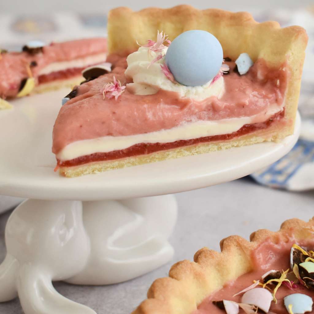 Decoro con ciuffi di crema chantilly, ovetti confettati di Pasqua e petali di calendula. Ecco la mia crostata di Pasqua alle fragole appena sfornata! La sua base croccante e la dolcezza del suo riepieno di fragole sono un abbinamento perfetto per festeggiare questa bellissima festività e l’inizio di un’attesissima primavera.