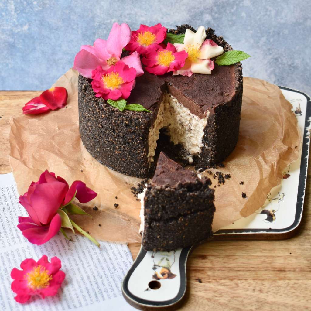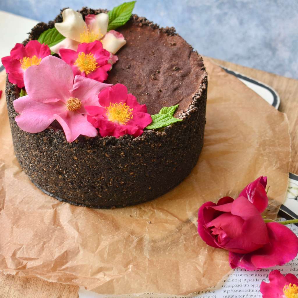 Farcisco il guscio della cheesecake con la crema appena ottenuta e ripongo in frigo per 3 ore. Preparo una ganache al cioccolato fondente: taglio grossolanamente 150 g di cioccolato fondente 50%, scaldo 150 ml di panna e la porto quasi ad ebollizione, la unisco al cioccolato e mescolo a mano fino ad ottenere una ganache liscia. La lascio intiepidire a temperatura ambiente e la verso sopra la farcitura per creare uno strato gustoso e croccante. Quando la ganache si è raffreddata la copro con una spolverata di cacao. Conservo in frigo fino al giorno dopo quando sarà perfetta, pronta per essere gustata! Io ho decorato la cheesecake in maniera abbastanza scenografica optando per le rose canine del giardino, ma in alternativa si possono creare dei ciuffetti di panna al caffè (panna montata con l’aggiunta di un cucchiaino di zucchero ed un caffè espresso freddo) o scaglie di cioccolato unite a delle foglie di menta.