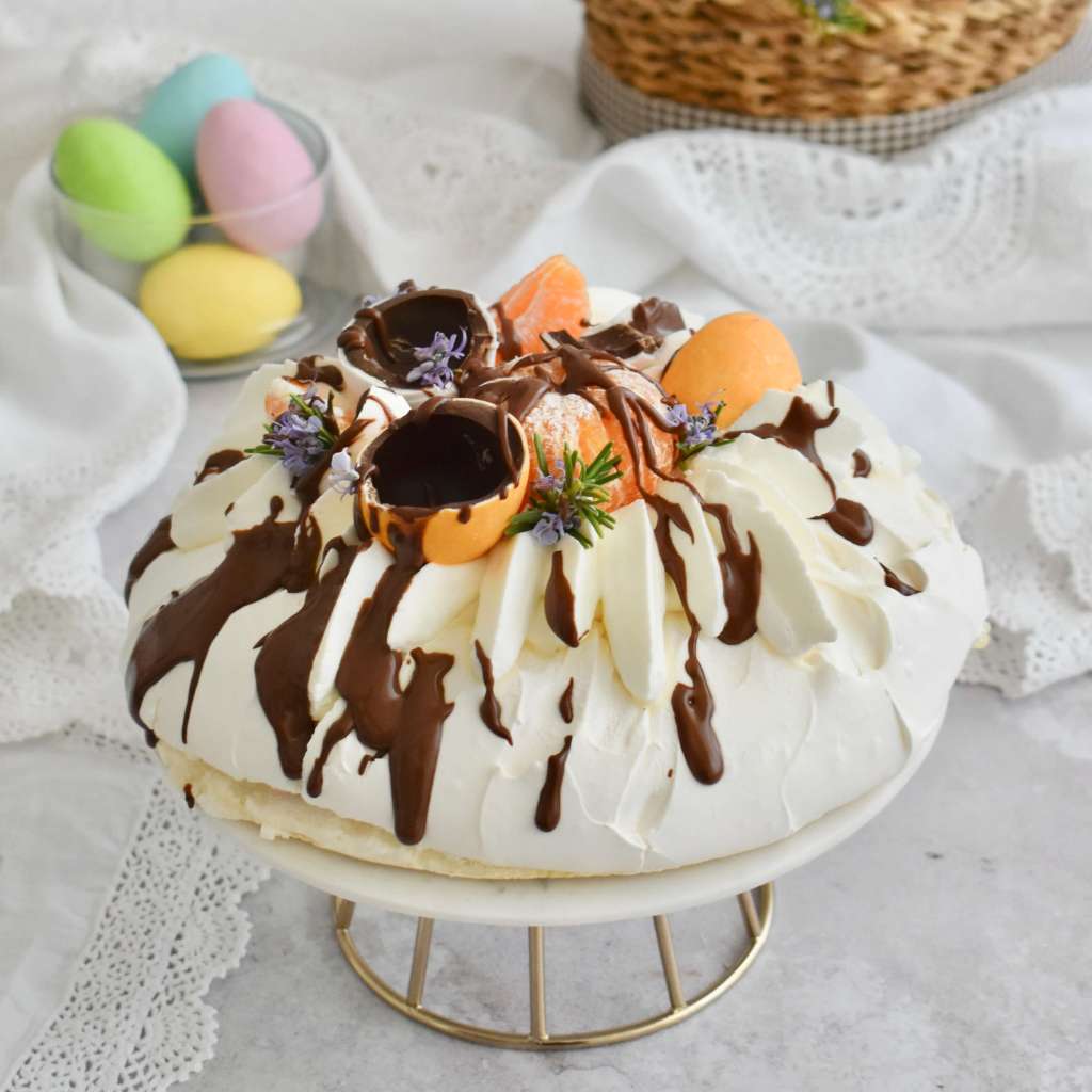 Preparo velocemente una ganache al cioccolato fondente: faccio scaldare la panna fresca in un pentolino portandola a sobbollire, poi la verso in una ciotola con il cioccolato, mescolo fino a quando non ottengo un composto liscio e lucido e lo metto da parte per farlo intiepidire. Decoro con mandarini, zucchero a velo, uova confettate e colate di cioccolato fondente che aggiungono un tocco di golosità! La pavlova si conserva in frigo per due giorni. Io vi consiglio di preparare le meringhe il giorno prima rispetto a quando volete servire il dolce e di completare il tutto il giorno dopo appena prima dell’occasione.