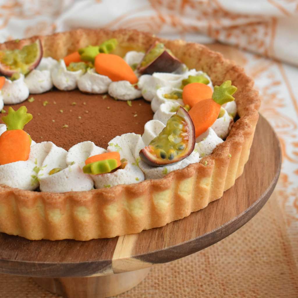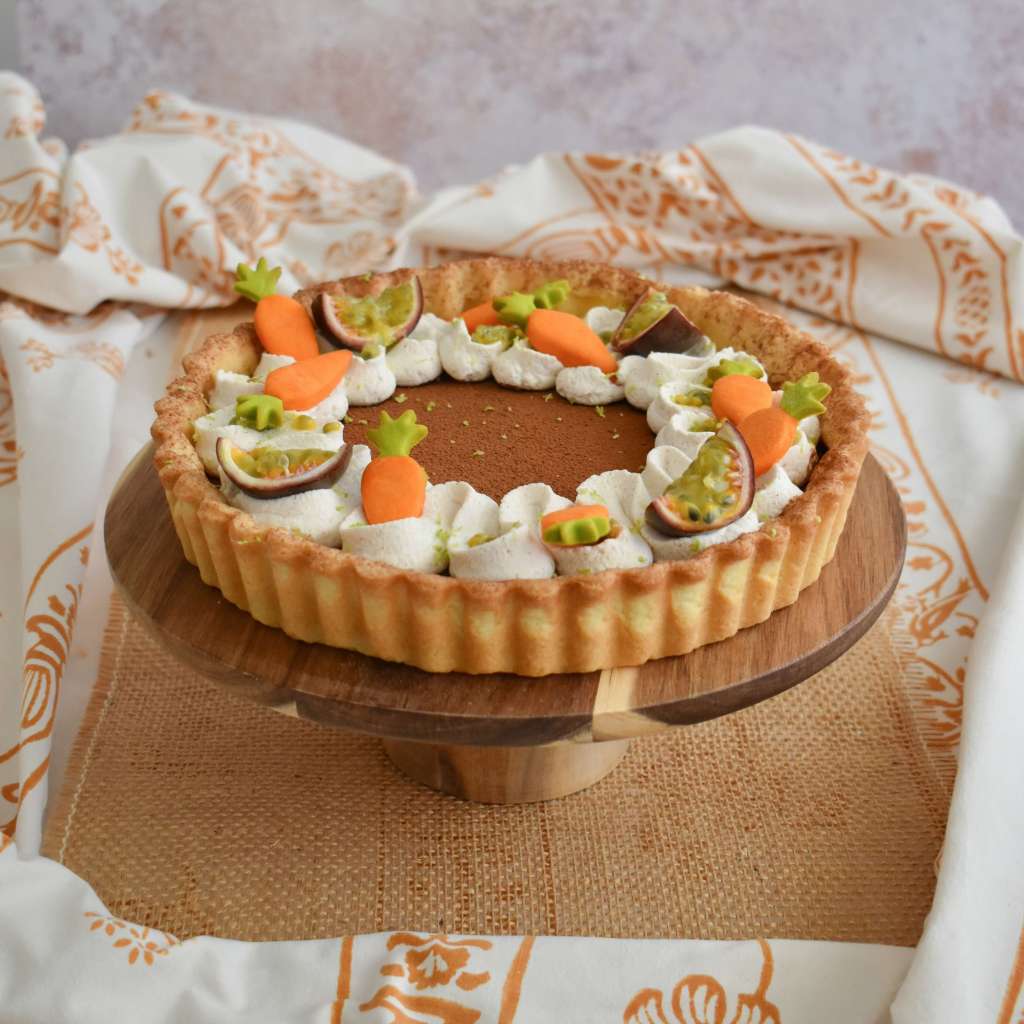 Monto la panna con un cucchiaino di cannella e creo una decorazione intorno alla cornice della crostata, poi decoro con carotine di frolla, scorza di lime e passion fruit.