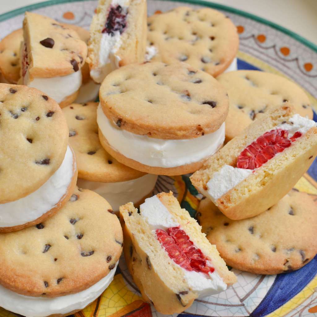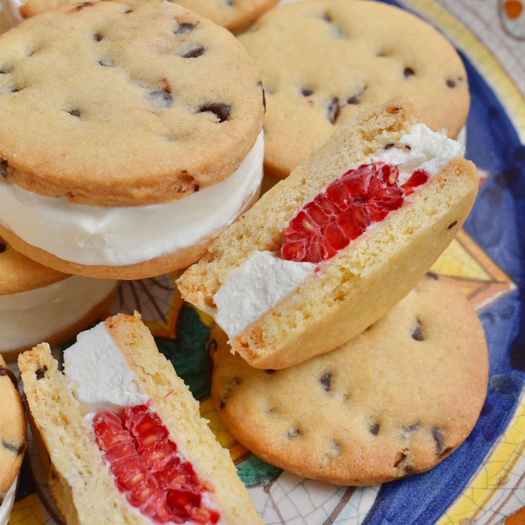 Mi dedico al gelato, realizzato in casa senza gelatiera. Prima di ottenere una consistenza soddisfacente ho fatto varie prove con diversi ingredienti, ma il risultato migliore l’ho ottenuto con lo yogurt greco. Il procedimento è molto semplice: monto la panna con le fruste già ben fredde (e se possibile anche il recipiente), la metto da parte. Mescolo a mano lo yogurt greco con il latte condensato, una volta amalgamati aggiungo man mano la panna montata incorporandola delicatamente con movimenti circolari dal basso verso l’alto. Farcisco i miei cookie aiutandomi con una sac à poche o, come ho fatto io, con un cucchiaio. Ci vorrà un po’ di pazienza e precisione, ma vi assicuro che ne vale la pena! Una volta aggiunto il gelato, ancora morbido, arricchisco il tutto con un lampone o una mora e chiudo con il secondo cookie. Conservo in freezer, ricordandomi di scongelare le frolle gelato almeno 15-20 minuti prima di mangiarli. Quando il gelato non sarà più ghiacciato ma inizierà ad ammorbidirsi la consistenza sarà ideale per il consumo.