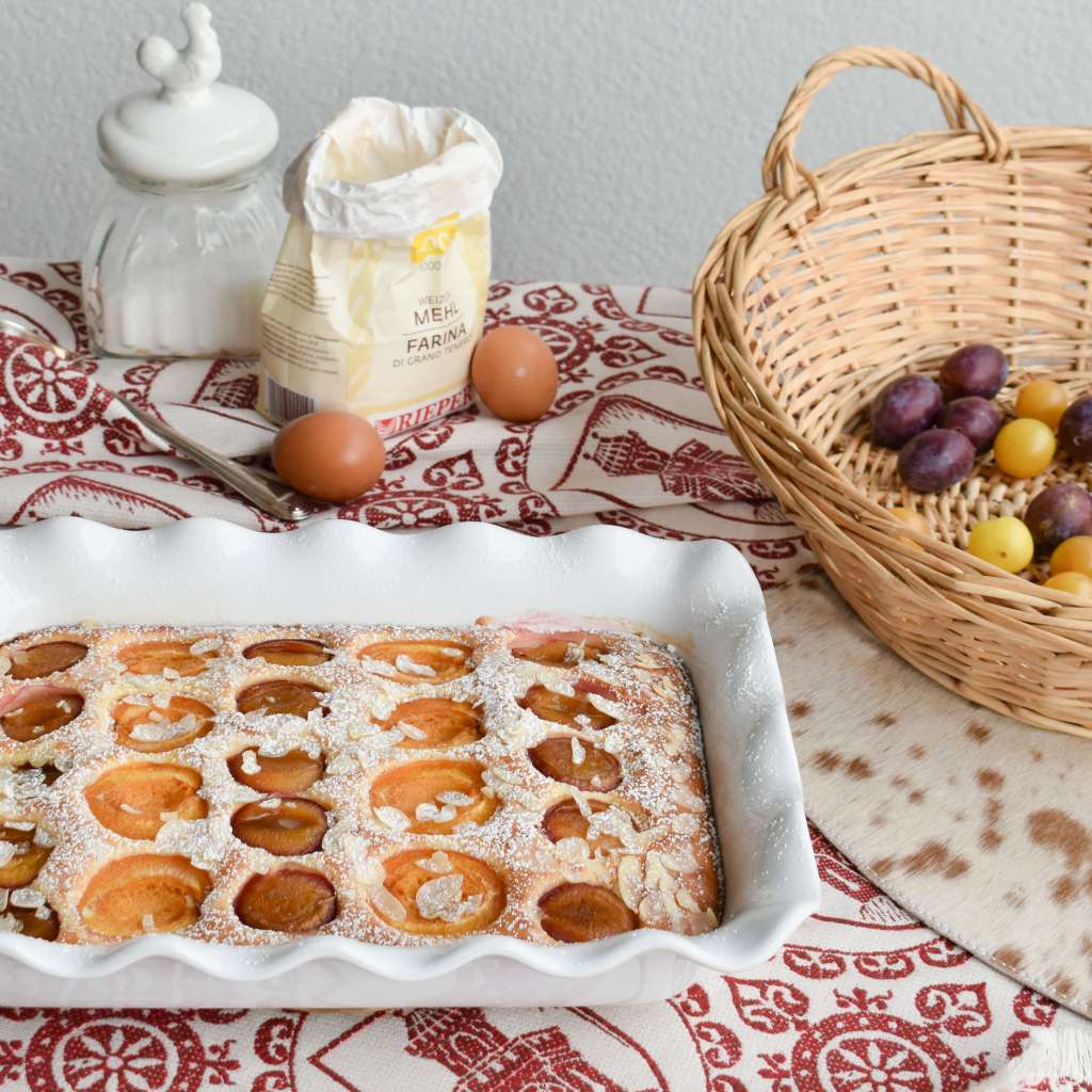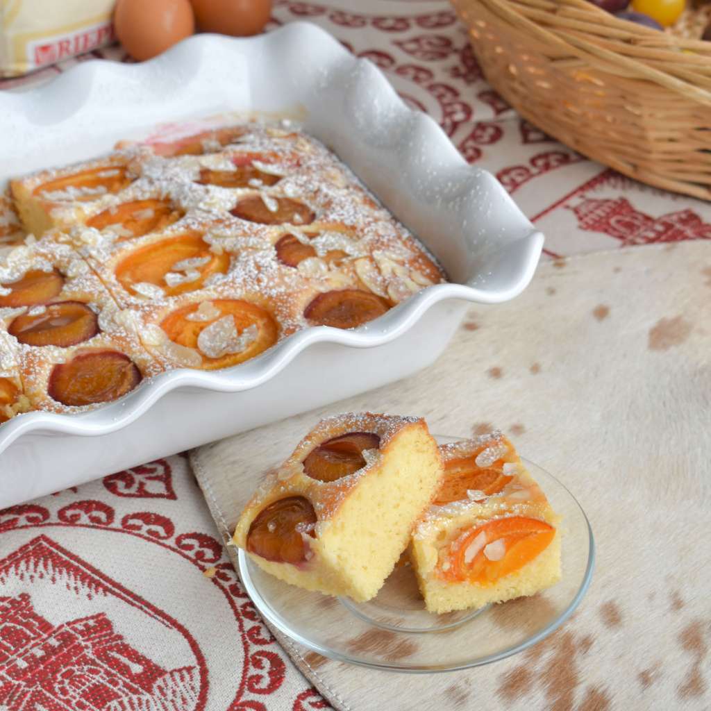 Versa l’impasto nello stampo preparato, livellandolo con una spatola. Disponi le prugne e le albicocche sulla superficie dell’impasto e cospargi con le mandorle a lamelle. Cuoci in forno preriscaldato per circa 35 minuti, finché la torta non è dorata e uno stecchino inserito al centro esce pulito.